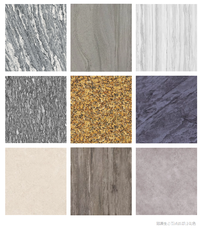 冠源生态石英砖一经亮相便惊艳市场,凭借着丰富多样的花色和时尚大气的质感,与传统瓷砖的廉价感形成鲜明的对比,让人感受新颖、别具一格。
